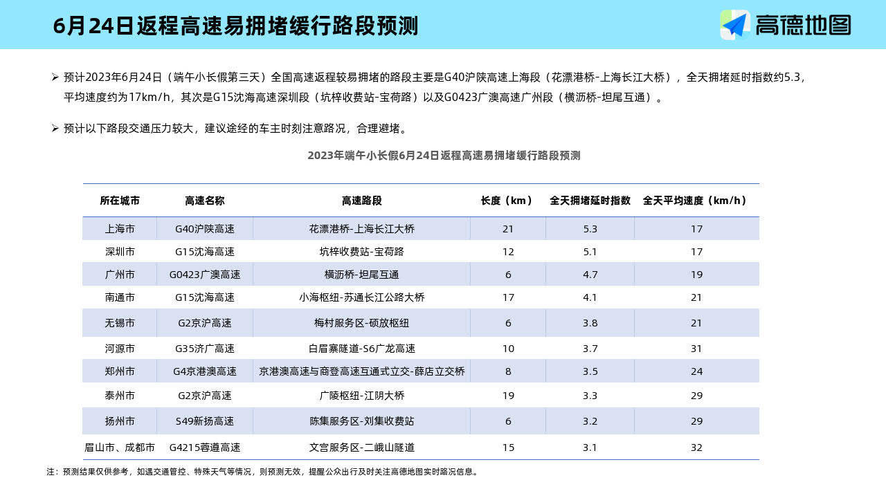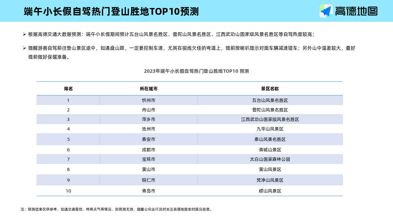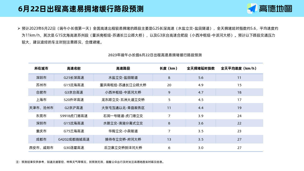 高德地图联合全国近20+交通管理部门发布了《2023年端午小长假出行预测报告》,以下简称《报告》,《报告》中海量交通大数据来自高德地图及行业浮动车数据,预测结果主要参考多年历史同期数据,同时结合近期数据,通过大数据技术、机器学习、综合研判等方法得到,为广大群众节假日安全出行提供科学参考。