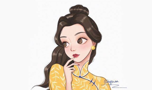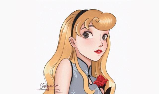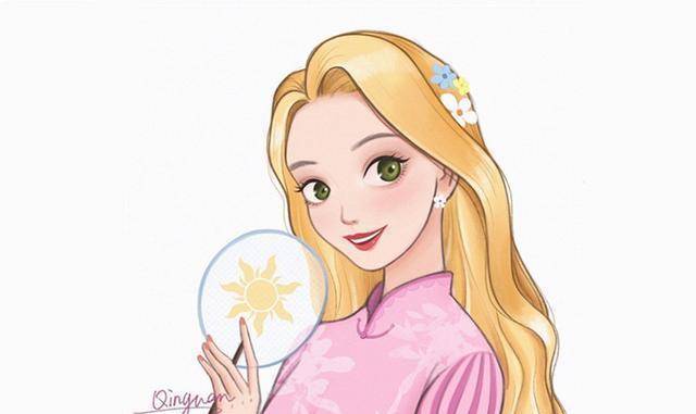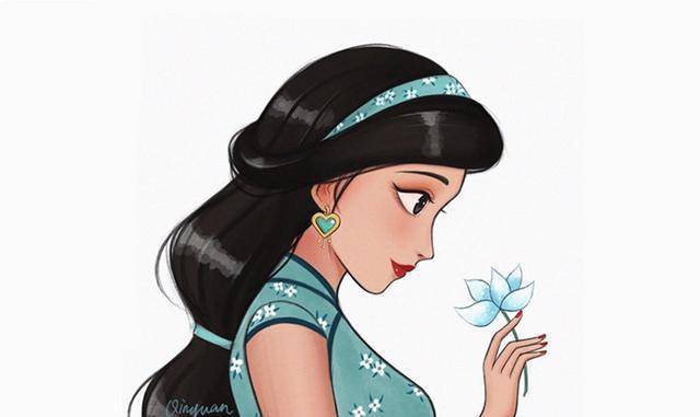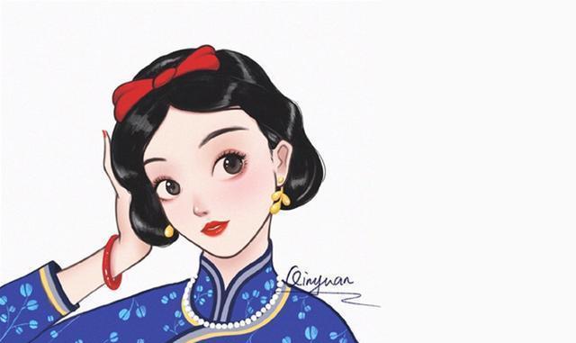 相信大家都看得出来,这位画师不仅在姑娘们的表情上下了不少功夫,而且每个姑娘的旗袍都设计得非常有趣。它们都是根据迪士尼公主的特点绘制的。他的旗袍的配色、图案等都和原著中公主们穿的衣服很匹配,同时又加入了一些自己的理解和创意。