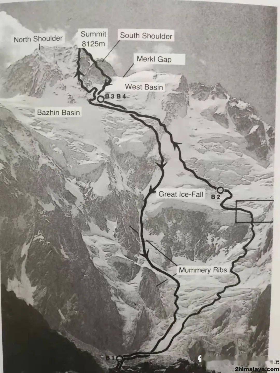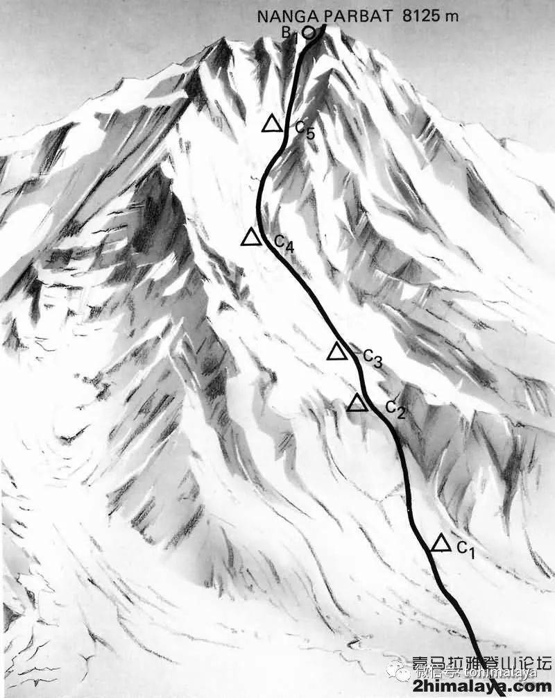 Messner在南迦帕尔巴特峰Diamir山壁的攀登和下撤线路