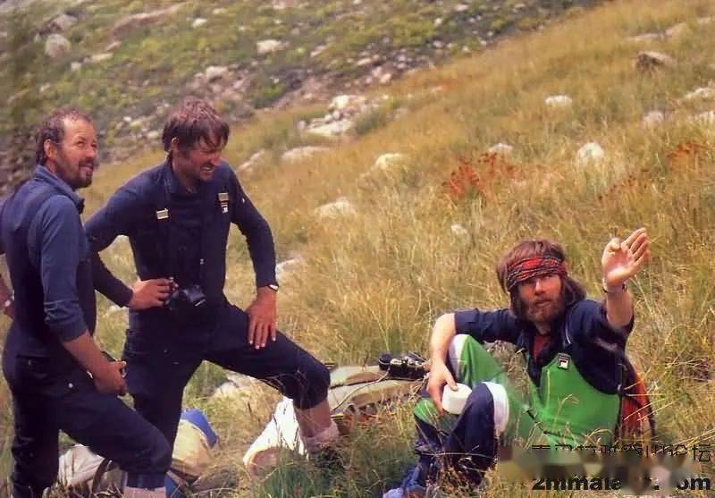 1970年探险期间,Reinhold,坐立与同伴们讨论可能的线路