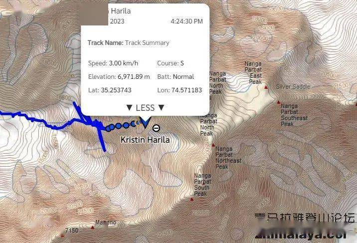 幸运的是,部分攀登者分享了他们的行进记录仪数据。Harila的设备显示,她正在去往山峰4号营地。6月26日,她会从这里去往顶峰。