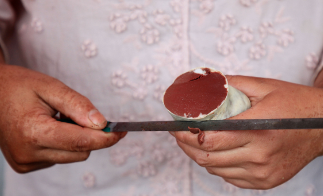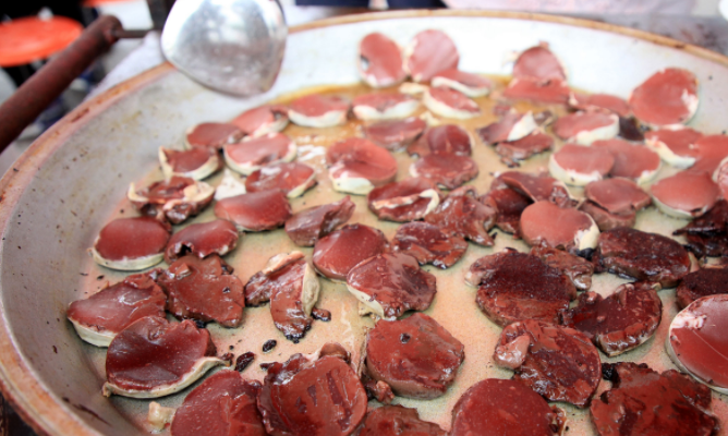 河南人“嗜血成性”程度可以说是很大的了。血不仅可以炒、可以煮、可以炸,就连涮火锅,也必不可少。煎血、灌肠、血糕是安阳血制品中的扛把子,散布在街头巷尾,人气颇高。煎血和灌肠通常一起售卖,一般小摊就摆在桥头路口或街道小巷。卖家推个三轮车,一罐铁油桶做成的大煤火炉,里面抹着厚厚的泥巴,下面烧柴或煤球,火旺时火苗直勾勾的往上蹿。煤火上面是一个直径足有六十公分长的平面黑铁鏊子,不论煎血还是灌肠,都在这黑铁鏊子上煎的焦香。