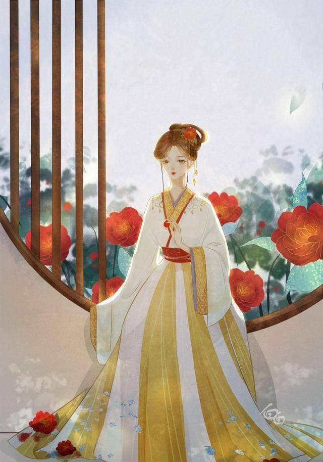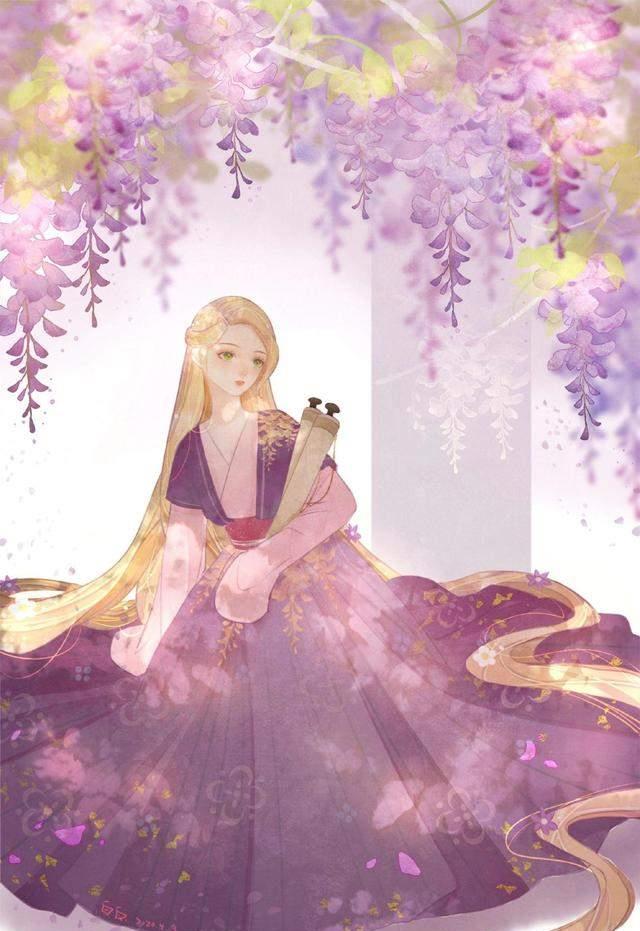 古代才女注重琴棋书画。看来长发公主长发公主应该更擅长画画。他手里拿着两卷卷轴,坐在地上。头上的紫色花朵与汉服的整体颜色很契合。那是什么花?紫藤?看上去不错。