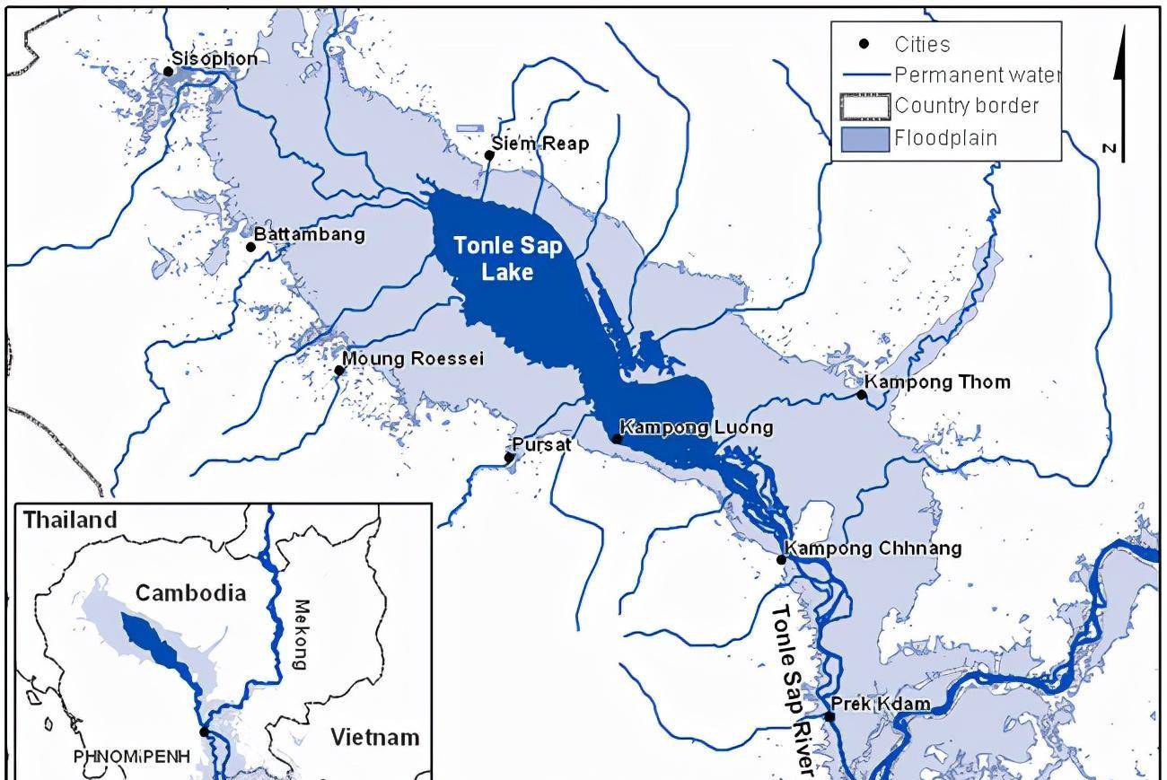 洞里萨湖,两种颜色便是枯水与丰水期的水域面积