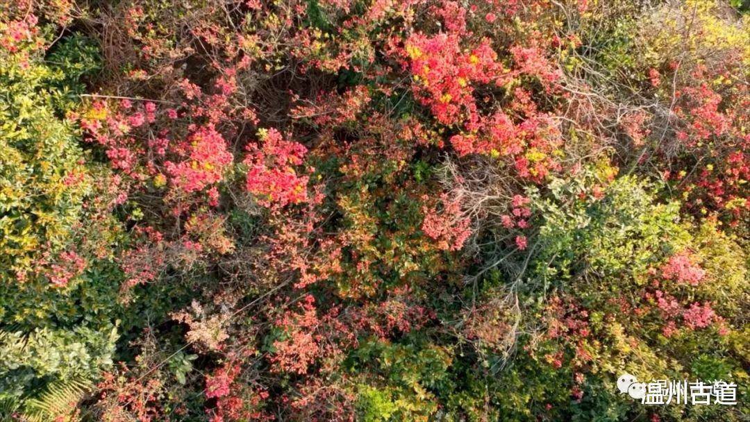 古道两旁,山顶熊熊燃烧。远远望去,山林被涂成红色,或像云朵飘浮在树上。