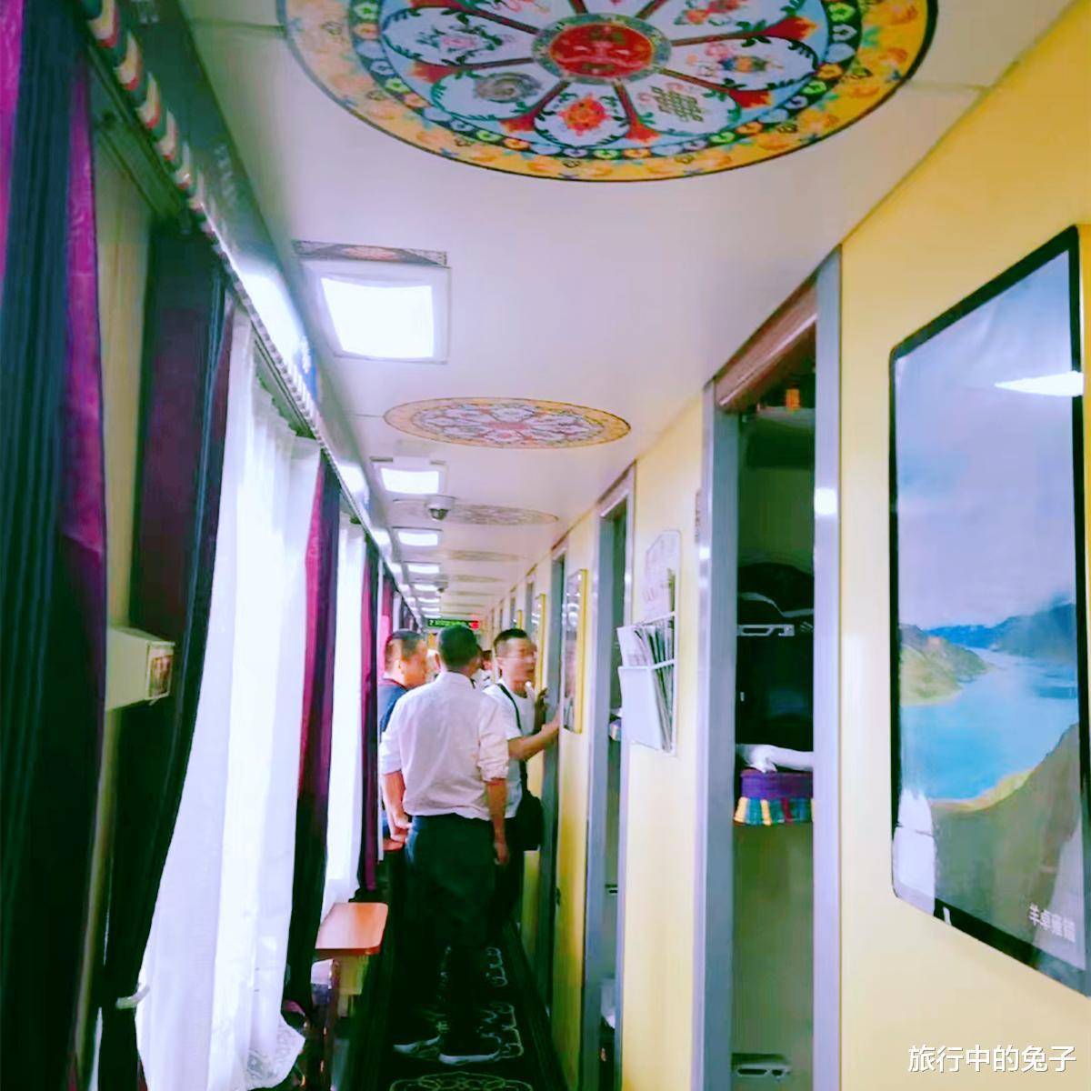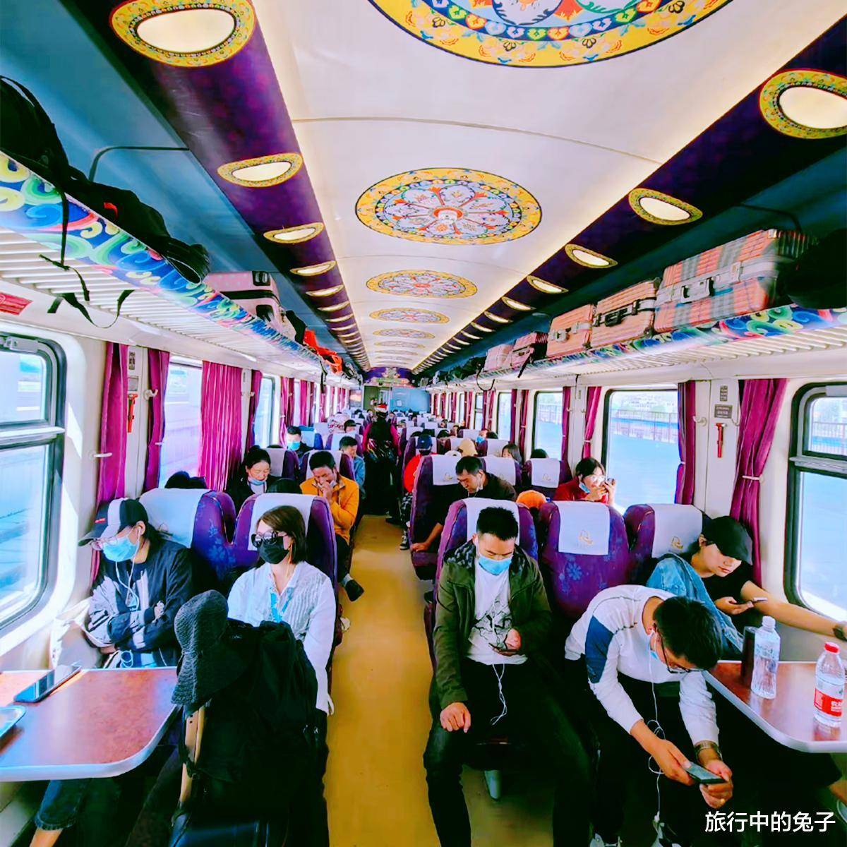 值得注意的是,这趟列车每节车厢的顶部都有独特的藏式图案,而内饰的颜色以奶白色为主,结合明亮的藏式图案,给人一种平静、舒适的感觉。
