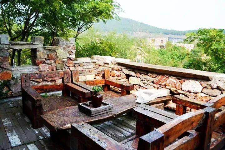 木雕的座椅、置物架与石墙相得益彰,擦出艺术的火花。