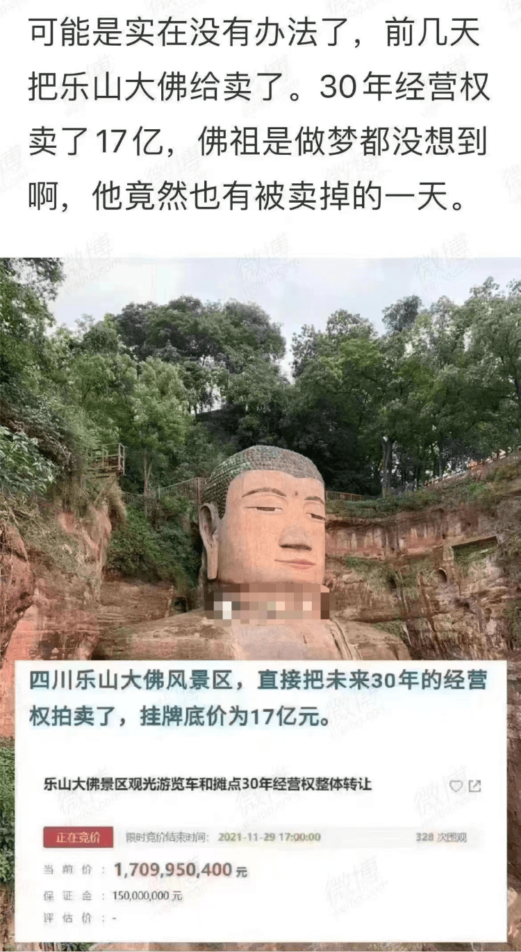 该消息称,“前几天把乐山大佛给卖了。30年经营权卖了17亿,佛祖是做梦都没想到啊,他竟然也有被卖掉的一天。”