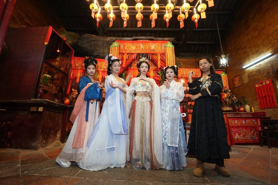 刘威龙(图右)与志同道合的朋友穿汉服在洪圣庙内开心打卡,庙内还有云板、石器古物、鲁班像等珍贵文物可观赏