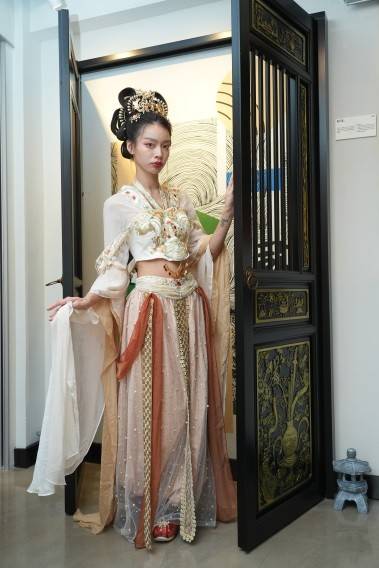 模仿敦煌壁画上仙女造型的陈晓华,可谓汉服”超级爱好者”,她于大约三年半前开始爱上穿汉服,至今花费半百万收藏逾300套汉服,并于2021年中成立’只此青绿中国历史及汉服文化社’汇聚汉服爱好者,定期举办穿汉服活动,冀传承中华传统文化。晓华身体力行推广她对汉服的热爱,无论上班或与朋友外出,一年四季都穿汉服,因此她大赞创活MM2 Café为汉服爱好者提供一个绝佳好去处。晓华坦言穿汉服在香港仍未普及,希望有更多人共同推广:’Café内有多个极具中国特色的打卡位,例如壁画、屏风,加上旁边就是洪圣庙,有如穿梭古今时空,相信Café的优惠有助推广穿汉服热潮,让更多人认识这中华文化的重要一环!’