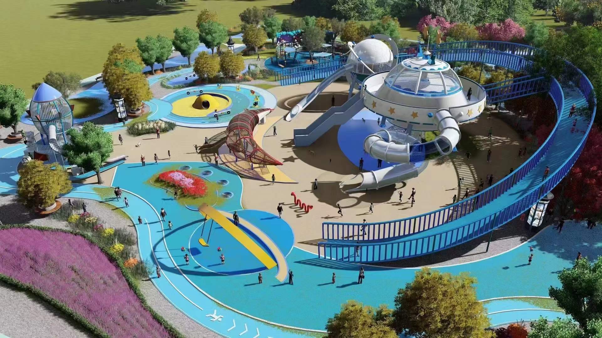 6.没有动机儿童游乐设施,这种公园游乐设施的特点是不使用非自然的外力和能量,具有游乐设施设备主动体验的特点。常见的类型有大型爬行、钻网、蹦床、不锈钢滑台、沙地、主题造型设备、丛林飞跃、物理膨胀等。