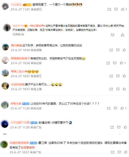 对公众而言,生育方面碰到问题,还是要去正规医院就诊,不要听信这些宣传,耽误了相关治疗。至于生不生双胞胎,还真得随缘。除了通过医学手段,可以肯定,喝几毛、一块钱一瓶的水,那是喝不来的!