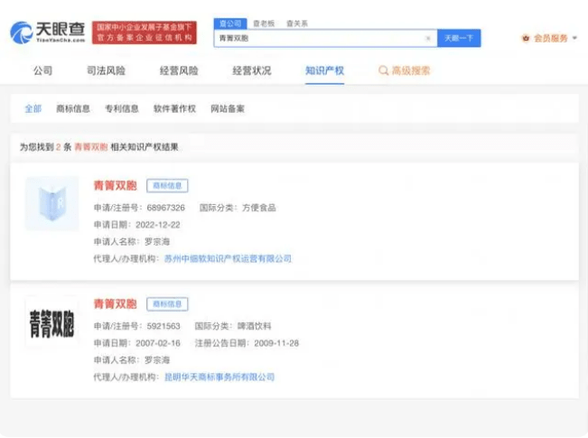 天眼查App显示,墨江双胞水厂成立于2013年10月,为个体工商户,其经营者为罗宗海,经营范围含饮料生产、食品生产、食品用塑料包装容器工具制品生产等。企业年报显示,该厂2021年从业人数为2人。此外,知识产权信息显示,罗宗海已注册2枚“青箐双胞”商标,其中啤酒饮料类商标申请于2007年,于2009年完成注册;方便食品类商标申请于2022年12月,于今年6月刚刚完成注册。