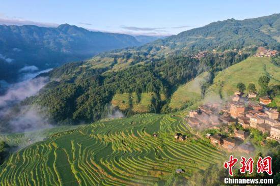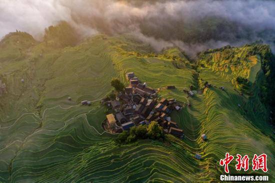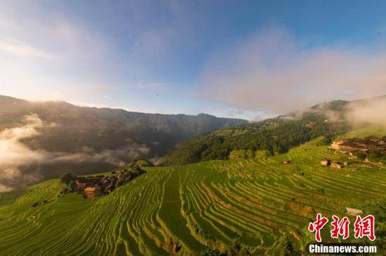 夏日,地处贵州省黔东南苗族侗族自治州从江县月亮山腹地的加榜梯田,阡陌纵横、绿意盎然。山峦、村庄、梯田在云海中若隐若现,宛若美丽的画卷,前来休闲避暑的游客络绎不绝。图为贵州省从江县加榜梯田核心区的东鹏梯田景色。吴德军 摄