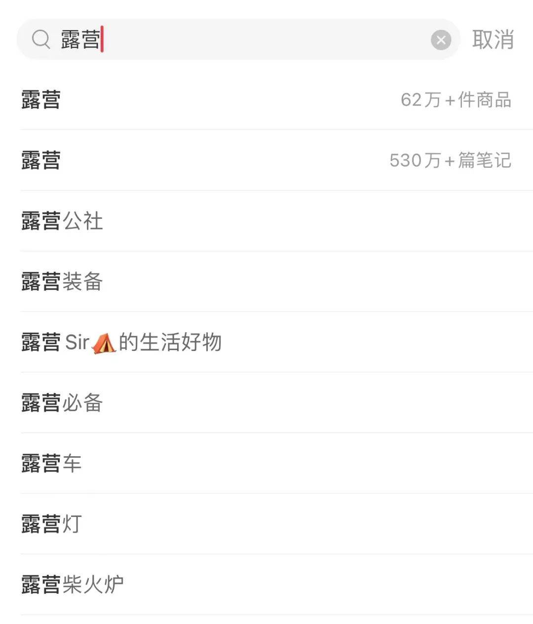 打开小红书,搜索“露营”关键词,可以看到超530万+的笔记,超62万+的直连商品,以及不计其数的露营衍生词条。