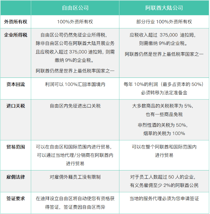 企业可以根据自身业务性质选择成立自由区公司或者阿联酋大陆公司。