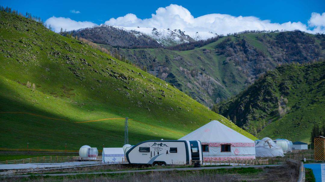 喀纳斯民俗风情园,灵感来自于喀纳斯游牧民的居所,毡房就是这片园子内的主角,与周围的草原完美契合,风情园本身便是一处风光打卡点。