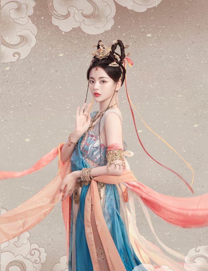 主要是指敦煌壁画上历代雕塑的修复方案。发型以尖瓣高冠为主。衣服不是典型的汉服,而是带有异域风情的时尚元素。造型。