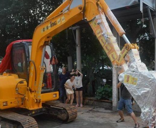 长沙,用2.5米高的工程挖掘机现场炒虾制作龙虾宴。