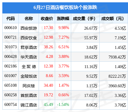 6月27日酒店餐饮板块较上一交易日上涨1.07%,西安旅游领涨。当日上证指数报收于3189.44,上涨1.23%。深证成指报收于10978.08,上涨0.97%。酒店餐饮板块个股涨跌见下表: