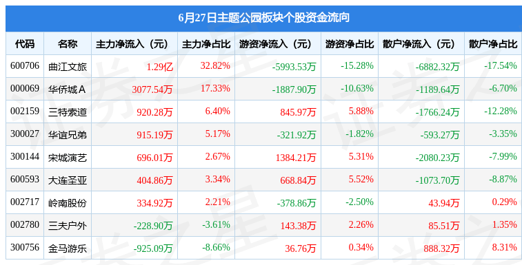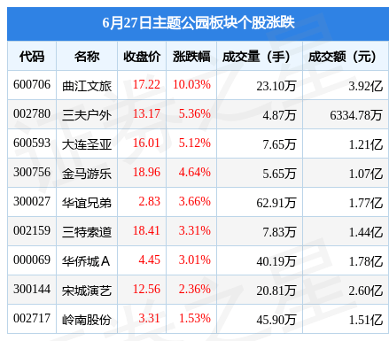 6月27日主题公园板块较上一交易日上涨3.24%,曲江文旅领涨。当日上证指数报收于3189.44,上涨1.23%。深证成指报收于10978.08,上涨0.97%。主题公园板块个股涨跌见下表: