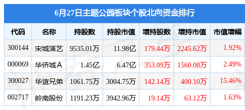 北向资金方面,当日主题公园板块北向资金持股市值为19.14亿元,增持0.43亿元。其中增持最多的是宋城演艺,增持了0.22亿元。主题公园板块北向资金持股变动明细见下表: