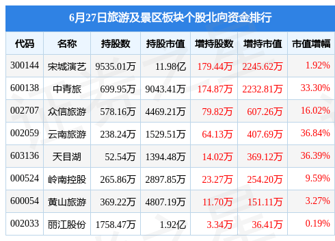 北向资金方面,当日旅游及景区板块北向资金持股市值为16.31亿元,增持0.63亿元。其中增持最多的是宋城演艺,增持了0.22亿元。旅游及景区板块北向资金持股变动明细见下表: