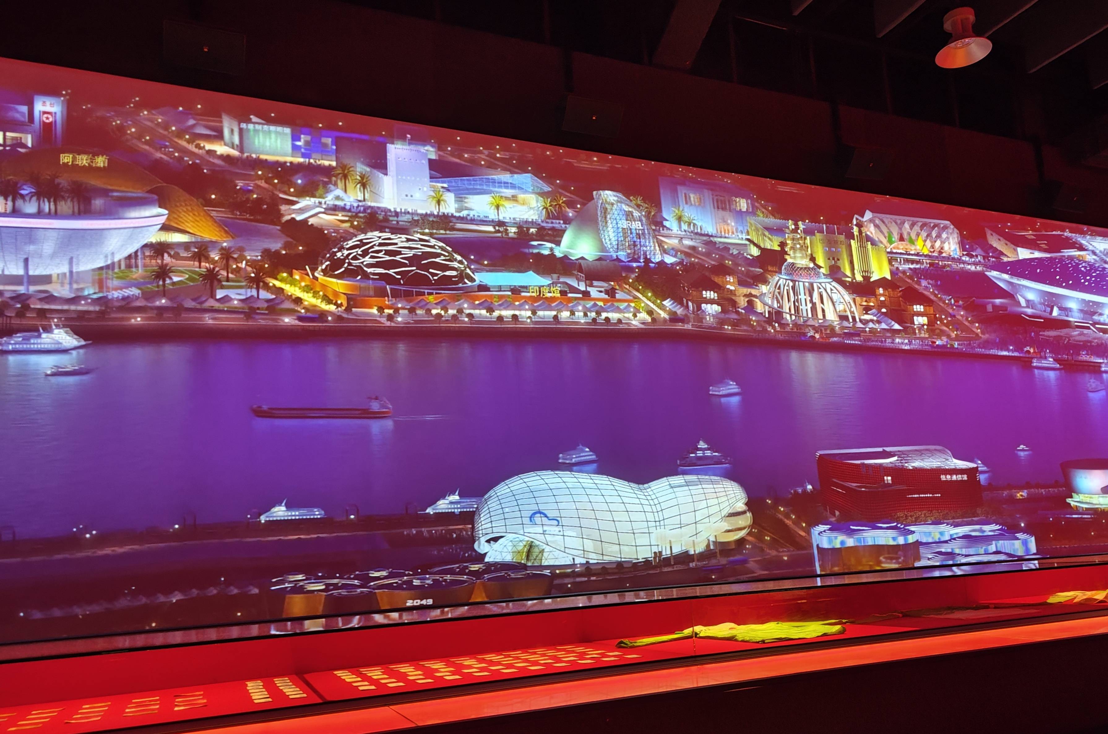 最激动人心的展览还是位于展馆最后的压轴大戏:上海世博会展览,它又让我们重温了那段激动人心的高光时刻。上海世博会可以说是历年来规模最大的一次,它集中展示了来自世界各地最新的奇思妙想,当然还有丰富多彩的文化。同时,也让中华文明有了一次向世人展示的机会。其中最吸引人的,是墙上大屏幕所展示的动态清明上河图,在这幅清明上河图中,人物和动物都活了起来,另外还有昼夜的变化,可谓生动形象。视频的结尾画风突变,画面转场为黄浦江两岸的上海世博会现场,这不正是现代版的清明上河图吗?