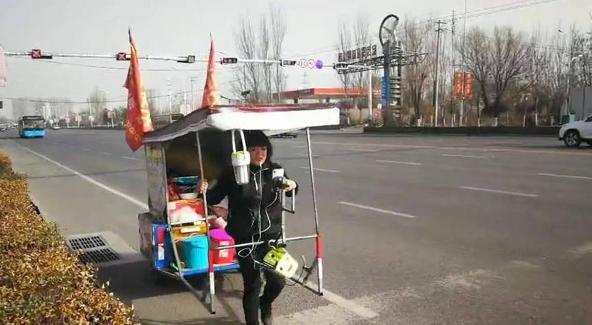 带上锅碗瓢盆,推上粉色小板车,“河南美美”开始了自己的徒步之旅。