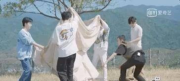 《春日酱》里露营只停留在表面形式。他们第一次在云南山野上露营时,五位艺人还有自己动手搭帐篷,大太阳底下,搭得满头大汗,有了点露营的气息。