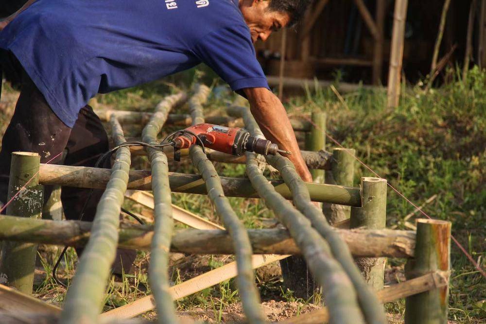 虽然没有专业的设计图纸,也没有设计标准,但并不妨碍小熊和工人们的有效沟通,甚至是更快速、心领神会的沟通,够用就行。最初建竹屋的时候,由于当地工人对这种结构也缺乏经验,小熊和工人们便一起探索,边学边干,很快就摸索出了门路,竹屋也很快成型,效果很好。