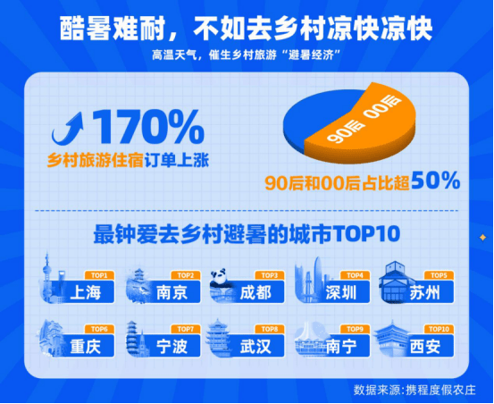 气温骤升,你会选择如何避暑,吹空调吃西瓜?今年,有一大批人选择了最复古的方式,去山里。相比城市景区活动,山间的乡村民宿因为环境和气温的优势,成为了更好更优的出游选择,而乡村旅游人数的增长,也带动了乡村经济的提升。刚刚过去的端午假期,全国各地的携程度假农庄迎来了爆发,整体订单量同比上涨超280%,而4家公益自营农庄的“一亩田”乡村农事、非遗手工艺体验活动参与率更是创下了86%的新高。