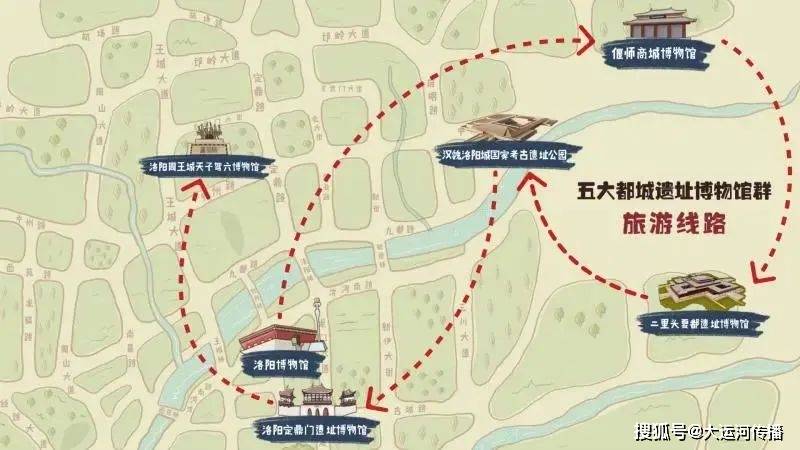 “五大都城遗址博物馆群”旅游线路为:洛阳博物馆——偃师商城博物馆——二里头夏都遗址博物馆——汉魏洛阳城国家考古遗址公园——定鼎门遗址博物馆——洛阳周王城天子驾六博物馆。(郭歌)