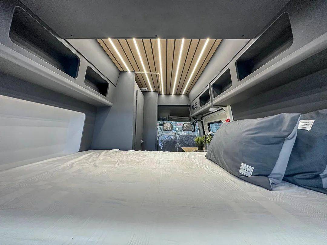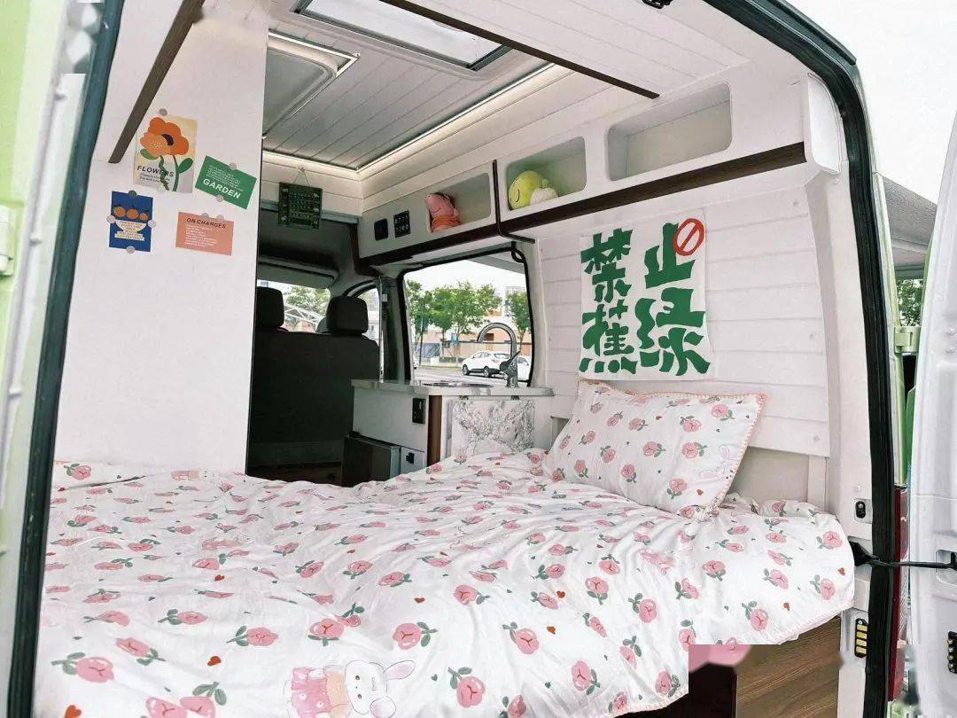 巧妙的设计让小小的空间也能拥有大大床铺,露营版卡座拼床尺寸为1880×1250mm;旅居版的固定床铺则是1900×1350mm。