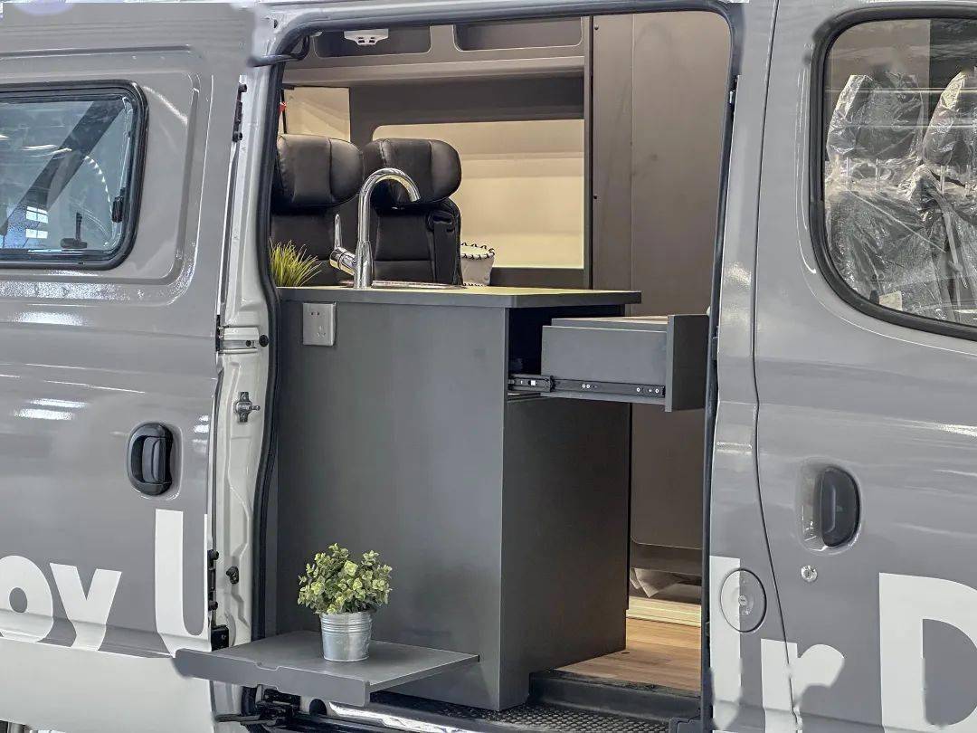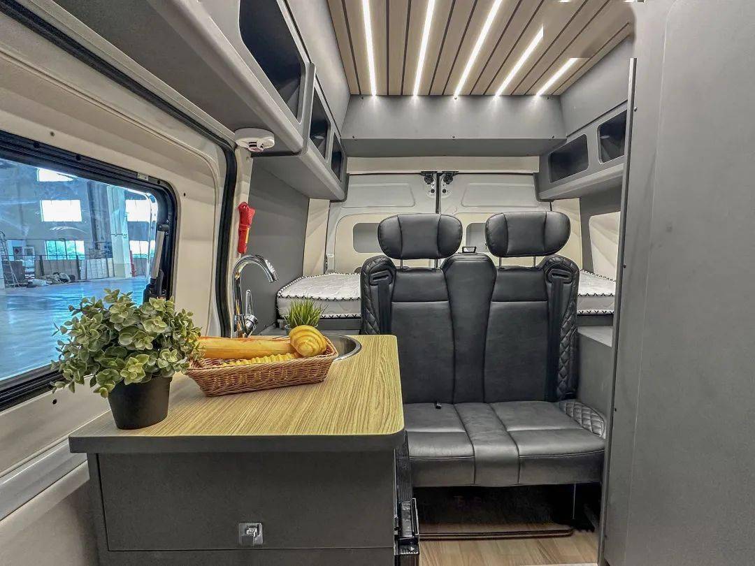 车厢内高1.9m,车身中部是独立的卫浴间和多功能的厨房区。