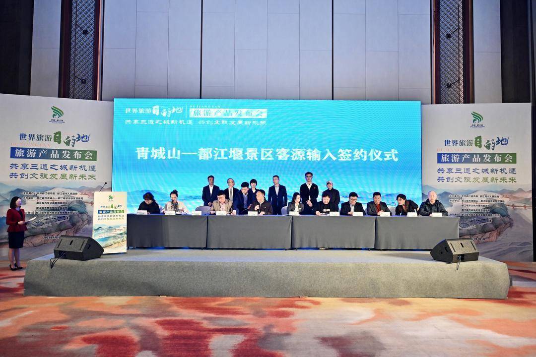 都江堰市政府与北京青鸟云游天下旅游有限公司、上海携程商务有限公司、国华旅游文化控股(广州)有限公司、凤悦酒店管理(江苏)有限公司签订了“都江堰市重点文旅项目战略合作协议”,依托世界旅游目的地旅游产品发布会平台,聚焦产业和文旅融合,深化毗邻地区文旅产业合作,积极探索拓展文旅市场高质量发展;青城山—都江堰景区与成都德蓉润景文化旅游有限公司、成都来也旅游发展有限公司、清华美院世界艺术史研究所大风堂中国画学研究会签订了“青城山-都江堰景区文旅项目合作协议”。