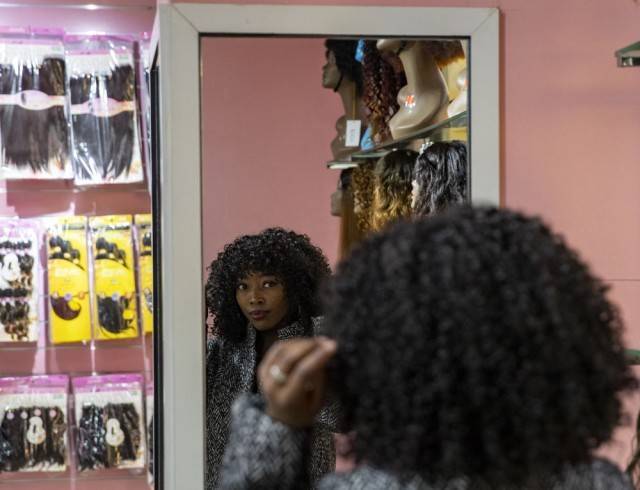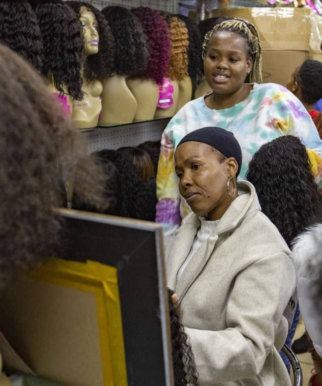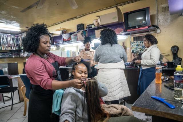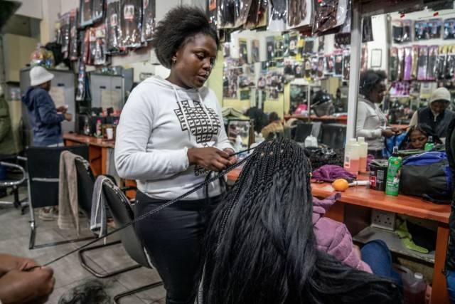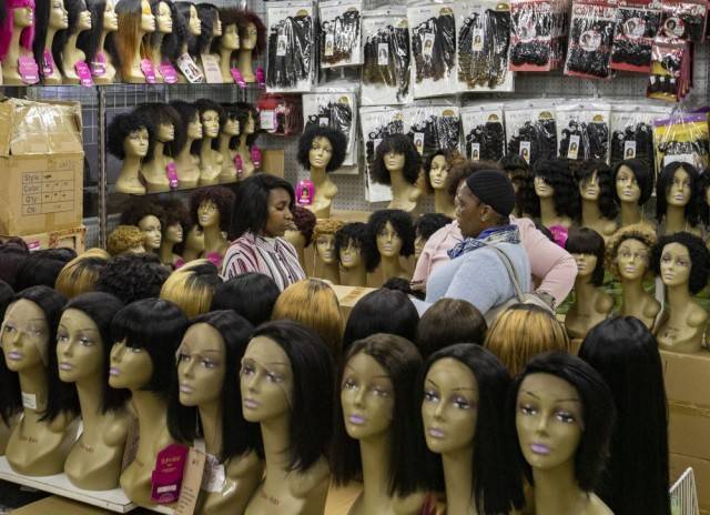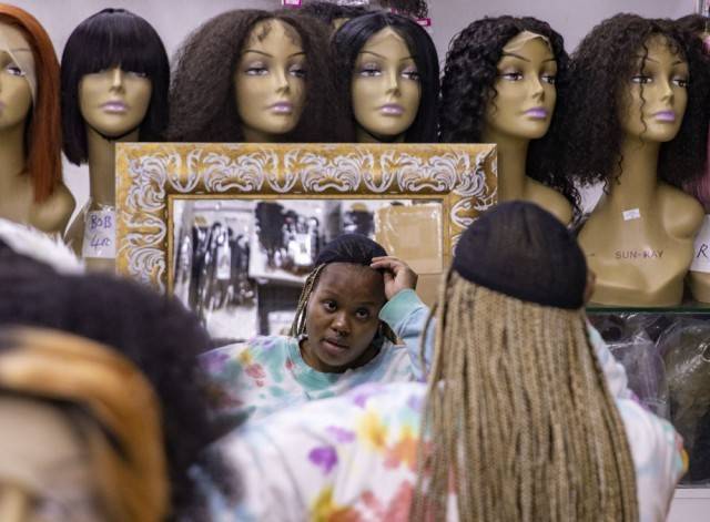 6月12日,在南非约翰内斯堡,美发师在美发店内利用假发为顾客造型。