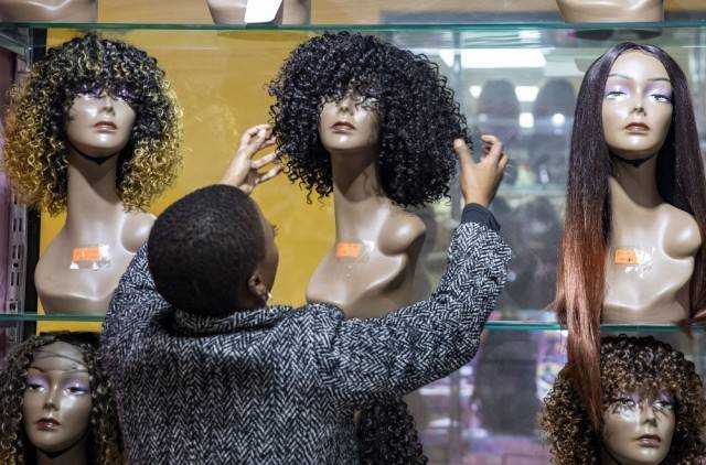 6月9日,在湖南邵阳美丽来发制品有限公司位于南非约翰内斯堡的店铺内,一名店员在整理展示的假发。