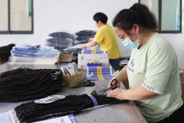 5月25日,工人在湖南邵阳阳光发品有限公司车间包装假发。