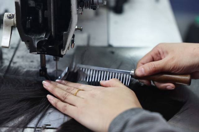 5月25日,工人在湖南邵阳美丽来发制品有限公司车间内生产假发。