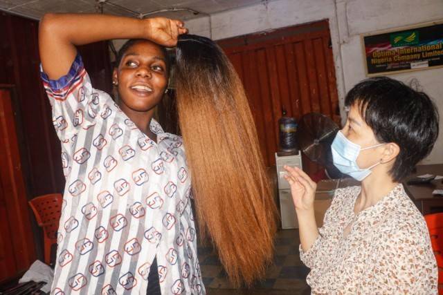 6月26日,在尼日利亚拉各斯,客户在湖南邵阳美丽来发制品有限公司的假发批发点进货以及试戴。