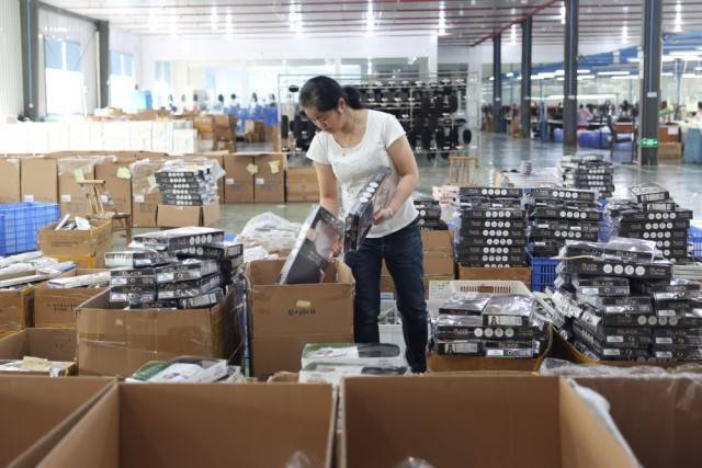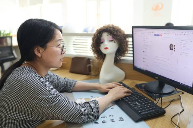 5月25日,工作人员在湖南邵阳阳光发品有限公司办公室内通过电商平台向海外销售假发。