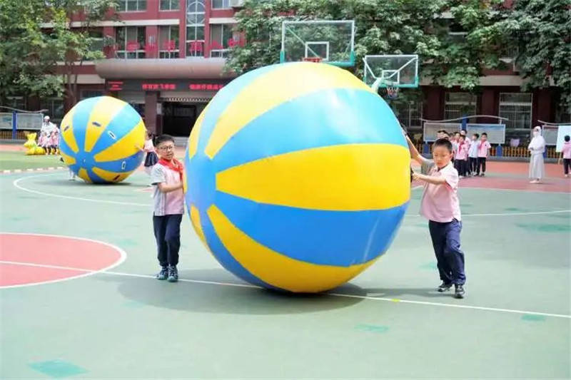 在众星捧月游戏中,同学们将球放在战鼓中间,分小组把球快速运到终点。
