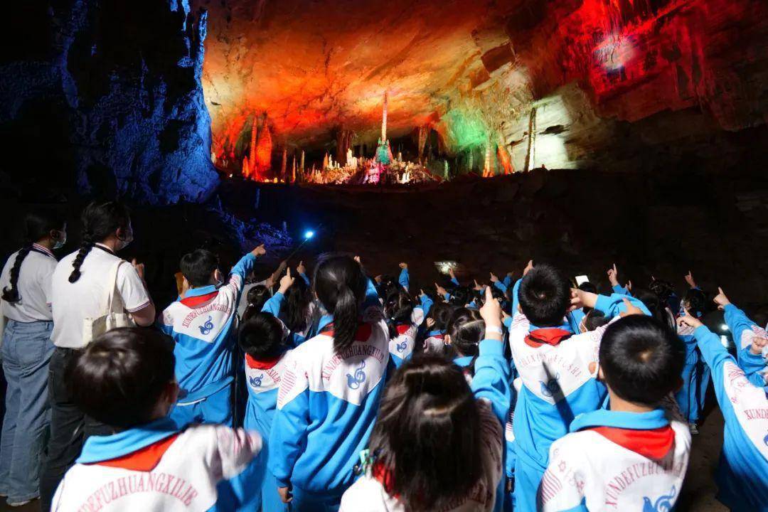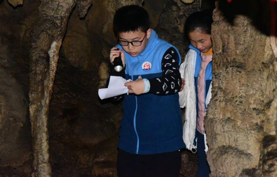 黄龙洞更注重学生自己去探索。老师会在前置课程讲解相关知识,然后发放寻宝地图,让孩子们自己去寻找喀斯特岩溶地貌的不同形态,并完成相关任务。除地质科普研学外,他们还能在不同季节参与更多其他的研学内容,比如在生态广场认识各种庄稼、树木和花卉,在龙舍学习土家建筑和饮食文化,跟着非遗工坊的师傅学做蜡染和拓染工艺品……遇见很多书本上学不到的东西。