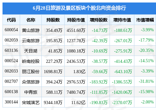 北向资金方面,当日旅游及景区板块北向资金持股市值为15.43亿元,减持0.7亿元。其中减持持最多的是宋城演艺,减持了0.24亿元。旅游及景区板块北向资金持股变动明细见下表: