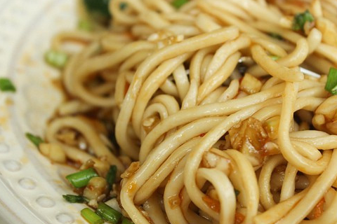 蒜拌面是一道简易却又美味的家常菜。作为著名的河南小吃,蒜蓉拌面只不过是在捞面条上浇上蒜汁,因为在河南方言中管捞面条叫“臊子面”,所以蒜拌面又称为“蒜蓉臊子面”。蒜拌面不仅清凉可口,而且具有杀菌抗衰的作用。制作时要将面条切成条带状,并将其与青菜一同煮沸,再在煮好的面上浇上蒜汁,再加上黄瓜、豆腐皮等配料。注意在阙蒜瓣时不要阙得太烂,同时可以放入辣椒油提色增味。