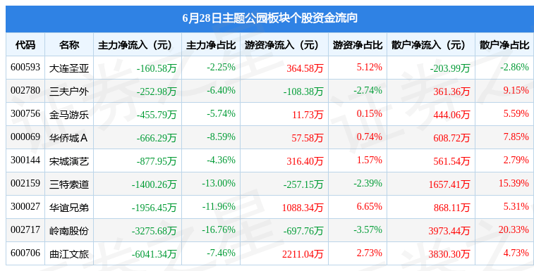 从资金流向上来看,当日主题公园板块主力资金净流出1.51亿元,游资资金净流入2986.37万元,散户资金净流入1.21亿元。主题公园板块个股资金流向见下表: