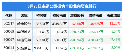 北向资金方面,当日主题公园板块北向资金持股市值为18.55亿元,减持0.41亿元。其中增持最多的是岭南股份,增持了469.85万元。减持持最多的是宋城演艺,减持了0.24亿元。主题公园板块北向资金持股变动明细见下表: