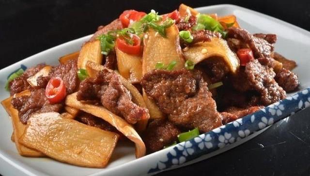 2、将切好片的牛干巴放入锅内,并放入花生米,继续翻炒约2分钟后,改小火;
