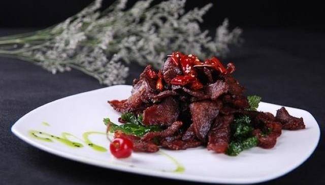 1、牛里脊肉洗净,按照灯影牛肉的做法烹调好。
